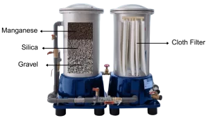 Karbon Filter menggunakan media berupa Cloth Filter dan Karbon Aktif yang berfungsi menyaring partikel kecil, menjernihkan warna air dan menghilangkan bau. Sand Filter menggunakan media berupa Gravel yang berfungsi menyaring partikel lebih besar, mengurangi ukuran partikel dan mencegah penyumbatan pada media lain. Manganese Green Sand berfungsi menghilangkan kandungan mangan dan besi yang terlarut dalam air. Dan Silica yang tidak hanya berfungsi memerangkap sedimen, namun juga dapat mengurangi kandungan logam berat dan unsur kimia pada air.