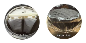 Kontak langsung antara karbon aktif yang terlarut dan kain filter membentuk lapisan dipermukaan cloth filter yang tidak hanya menangkap molekul besar namun juga mampu menahan partikel mikro dan flok, sehingga TSS (Total Suspended Solids) terkendali.